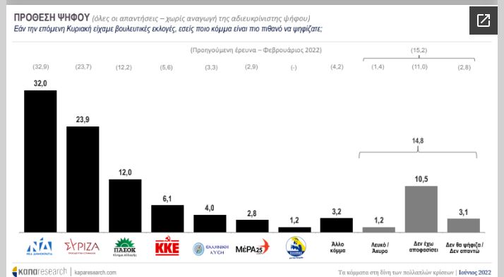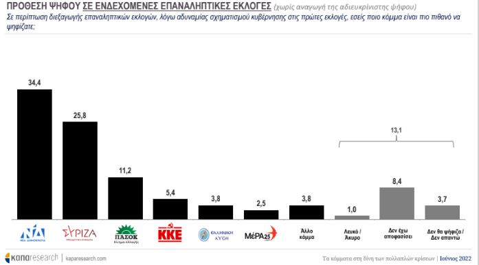 Την πρωτοκαθεδρία του Κυριάκου Μητσοτάκη και της κυβερνώσας παράταξης καταγράφει και η τριμηνιαία δημοσκόπηση της εταιρείας KAΠΑ Research, στην οποία η Ν.Δ προηγείται με 8,1% του ΣΥΡΙΖΑ, ενώ για πρώτη φορά καταγράφεται πρόθεση ψήφου σε ενδεχόμενες επαναληπτικές εκλογές που εκεί η διαφορά αυξάνεται στο 8,9%.