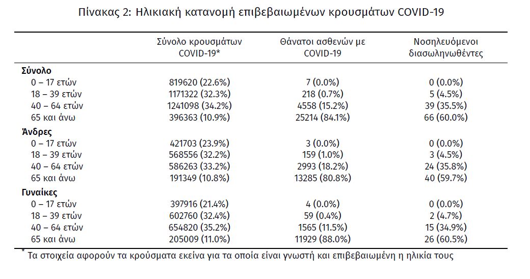 Οι νέοι θάνατοι ασθενών με COVID-19 είναι 17, ενώ από την έναρξη της επιδημίας έχουν καταγραφεί συνολικά 29.997 θάνατοι. Το 95.6% είχε υποκείμενο νόσημα ή/και ηλικία 70 ετών και άνω.