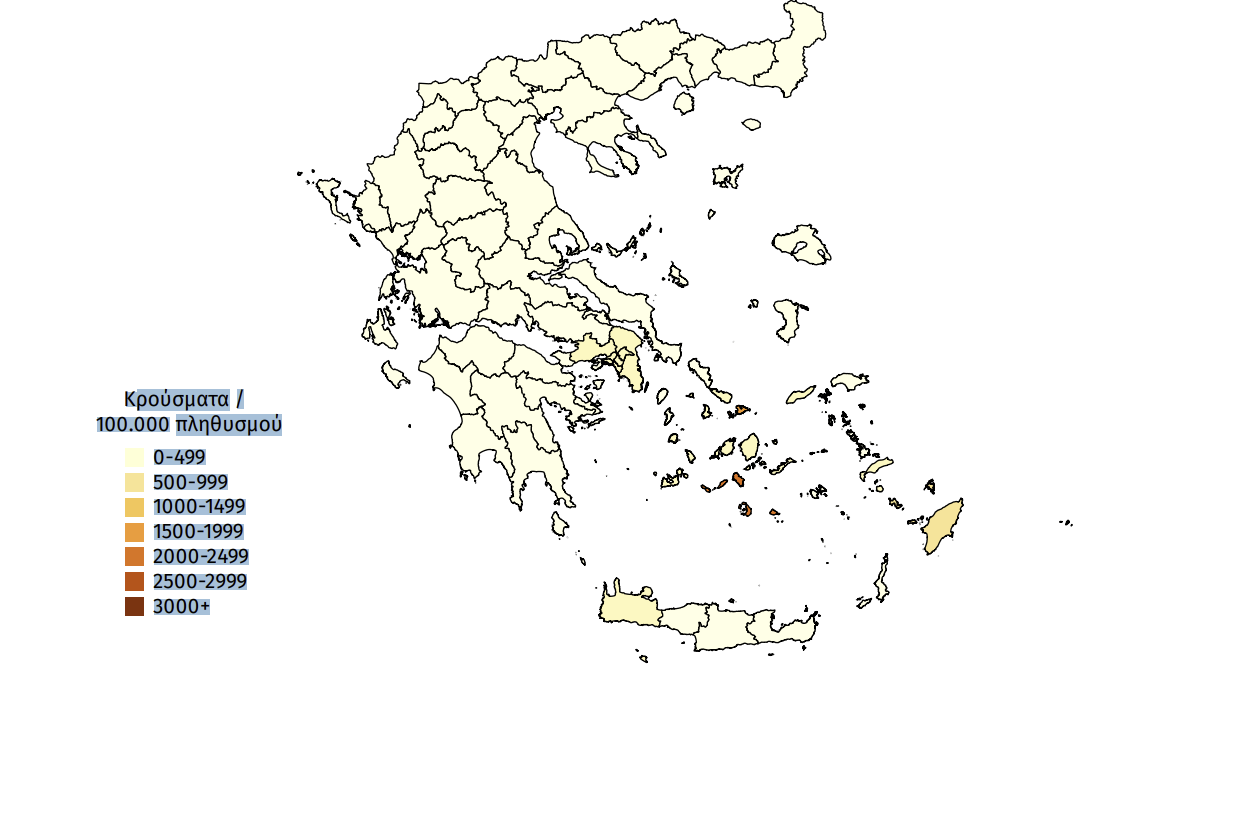 Γεωγραφική διασπορά: Ο χάρτης αποτυπώνει τη γεωγραφική κατανομή των κρουσμάτων COVID-19 των τελευταίων 14 ημερών ανά Περιφερειακή Ενότητα της χώρας, με βάση την δηλωθείσα διεύθυνση μόνιμης κατοικίας του ασθενούς, ή τη διεύθυνση προσωρινής διαμονής για τους τουρίστες και άλλους προσωρινά διαμένοντες στην Ελλάδα.