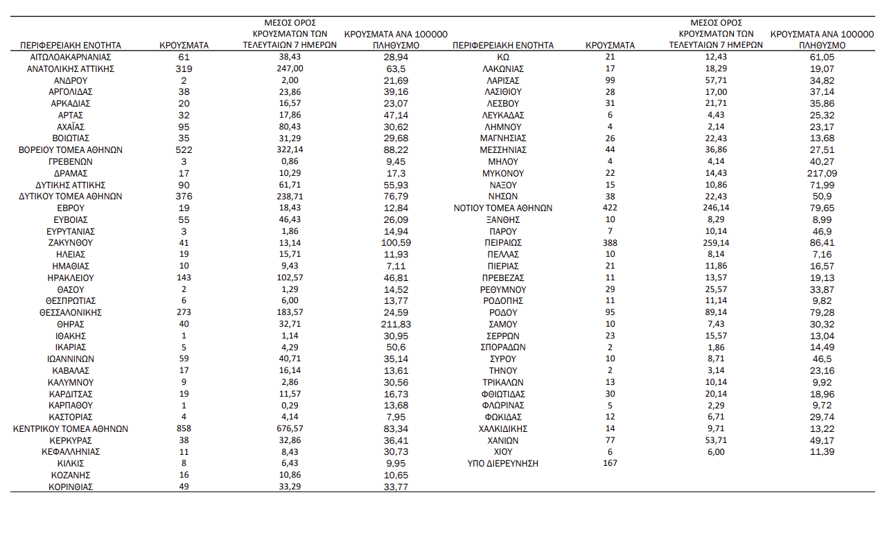 Κατανομή ανακοινωθέντων εγχώριων κρουσμάτων: Από το σύνολο των 5.057 νέων κρουσμάτων του νέου ιού στη χώρα 11 είναι εισαγόμενα. Η κατανομή των 5.046 νέων εγχώριων κρουσμάτων ανά Περιφερειακή Ενότητα παρουσιάζεται στον κατωτέρω πίνακα.4