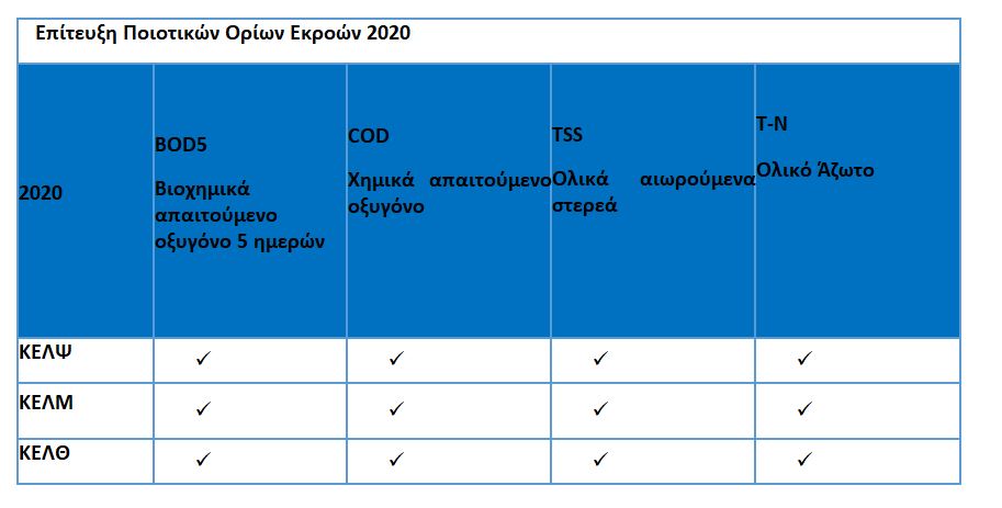 Η τήρηση των ορίων ποιότητας των εκροών, ανά ελεγχόμενη παράμετρο για καθένα από τα ΚΕΛ της ΕΥΔΑΠ για το 2020, αποτυπώνεται στον πίνακα που ακολουθεί: